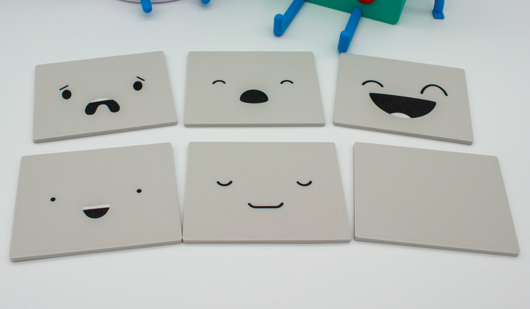 6 caras intercambiables: 5 con expresiones clásicas del personaje + 1 cara en blanco para que diseñes tu propia emoción.